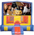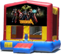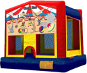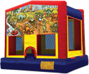 Various banners are available to add to the front of the bounce house to accomodate your particular party theme. It measures 19 ft x 16 ft. We need a couple feet of space around it for “wiggle room”. If you’re having the party at your home, all we need is a standard outlet to plug the air blower into. If you’re having the party at a park, you’ll need to rent a generator (at an additional price).